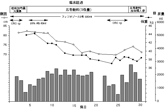 五苓散の三倍量を処方した。尿量が増え腹水は減少していった。